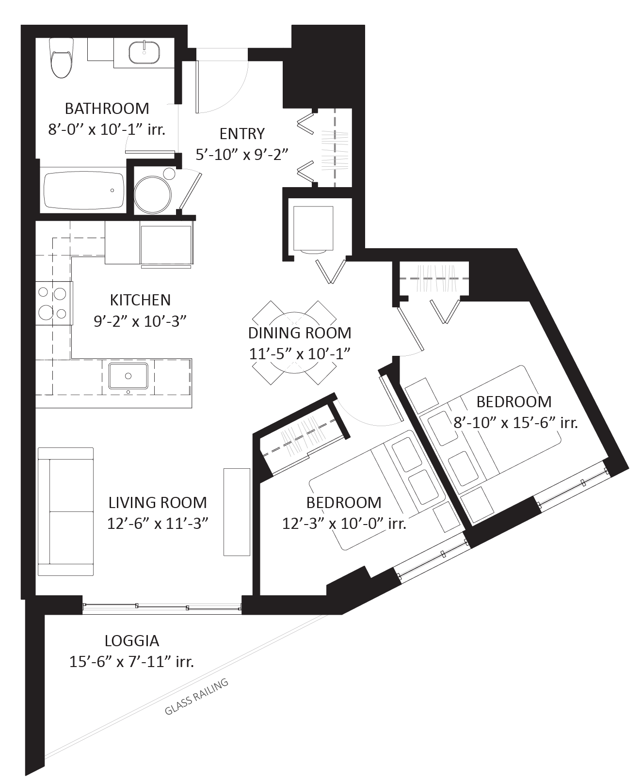 Modern kitchens equipped with soft closing drawers and cabinets, quartz counter-tops, stainless steel finished appliances and islands in select apartments