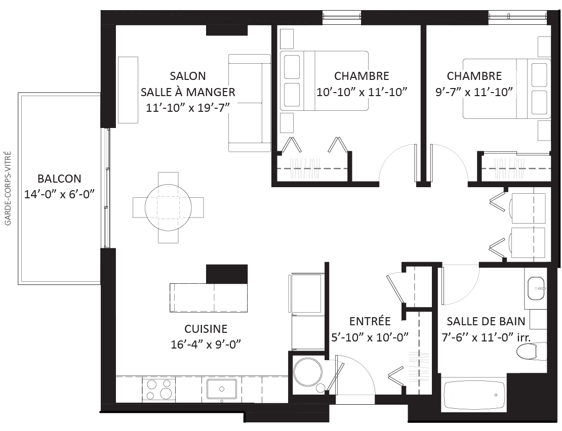 Les logements proposés sont de style contemporain offrant des typologies studio, une chambre à coucher (3 1/2), à deux chambres à coucher (4 1/2) ou à trois chambres à coucher (5 1/2) allant de 482 pi.ca à 1073 pi.ca